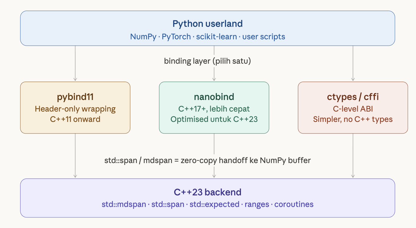 C++23 membuat jembatan antara dua bahasa ini lebih mudah dibangun. std::span dan std::mdspan menggunakan format memori yang sama dengan NumPy, sehingga data bisa berpindah antara Python dan C++ tanpa perlu disalin. Dengan library seperti pybind11 atau nanobind, fungsi C++23 bisa “dibungkus” menjadi modul Python dan dipanggil seolah-olah fungsi Python biasa.
